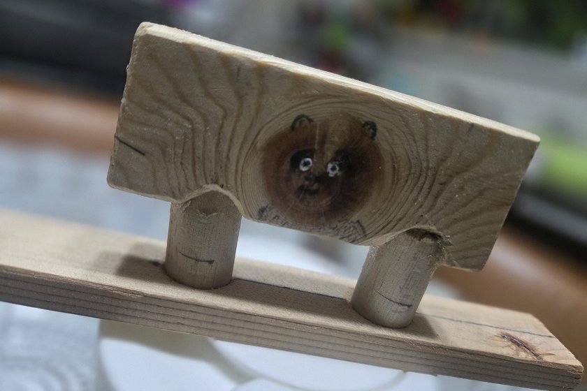 木の節の形と、描き足された目と耳が見事にマッチして、愛らしいタヌキの顔になってます!