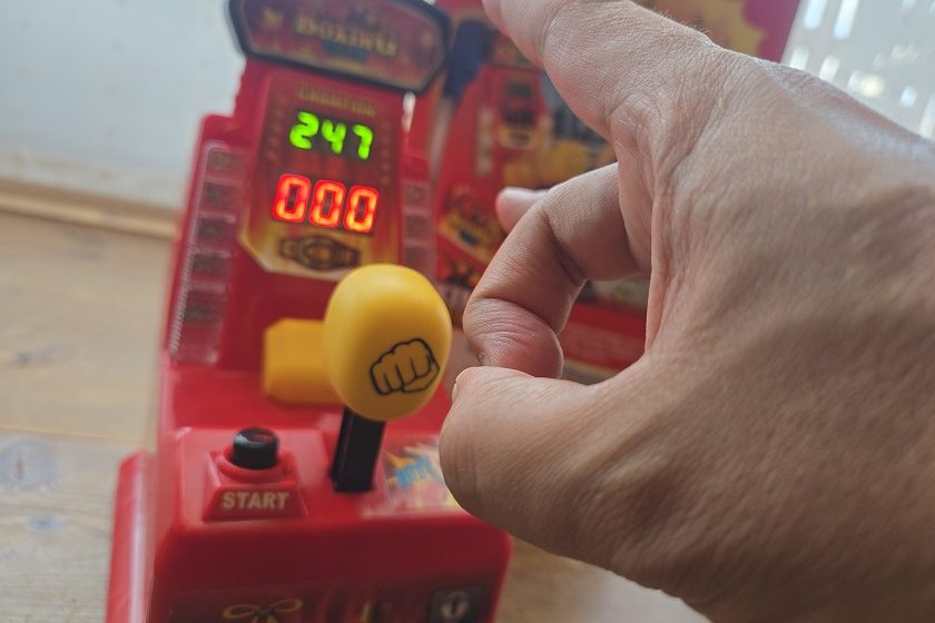 パンチングマシンならぬ、デコピンでスコアを競うという、なんともユニークなおもちゃです。