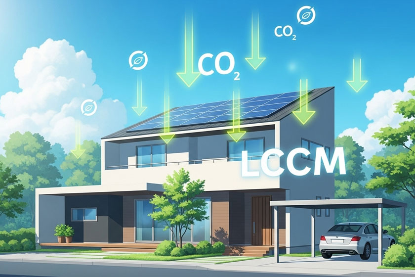 これは、太陽光発電などでエネルギーを創り、住んでいる間に使うエネルギーを減らすだけではありません。建設時に使う資材の製造・運搬から、解体時のCO2排出量まで、すべてを考慮して、最終的に差し引きゼロ以下にしようという、まさに究極の環境住宅なんです。