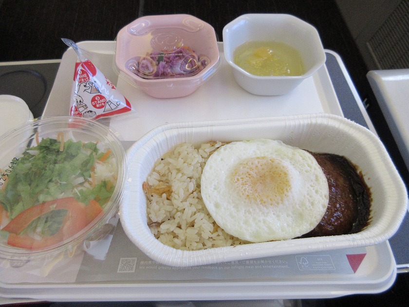 さて、お待ちかねの機内食!さっき運ばれてたのがこれかな?メインはジューシーなハンバーグでした。