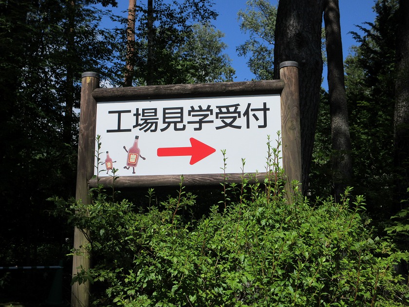 なんとも可愛らしい養命酒のキャラクターがお出迎えしてくれます。「工場見学受付」の文字と赤い矢印が、ワクワク感を高めてくれますね。