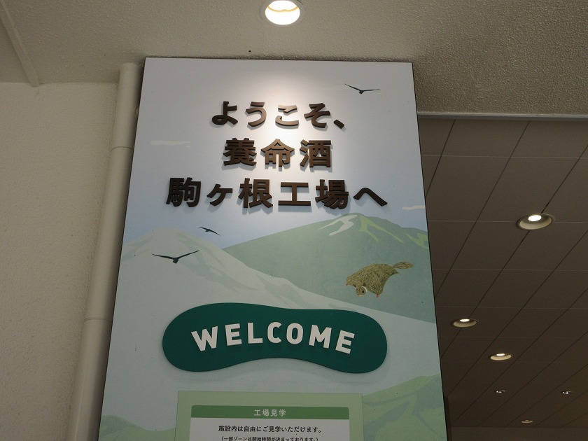モダンで開放的な建物に期待が高まります。「ようこそ、養命酒 駒ヶ根工場へ」の看板も、温かみがあって良いですね!