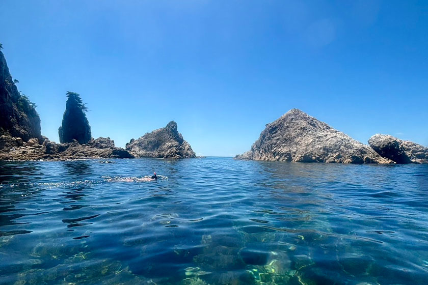 そして、この笹川流れの魅力は、その景観だけではありません。 日本屈指の透明度を誇る、エメラルドグリーンに輝く海も、大きな見どころの一つです。 海に潜ってみました。