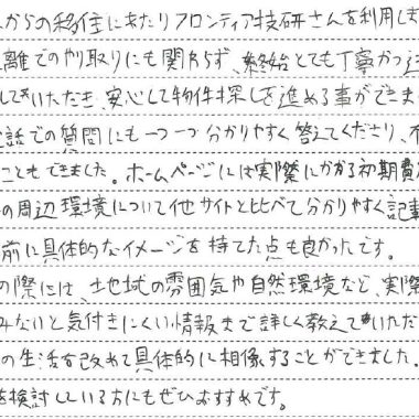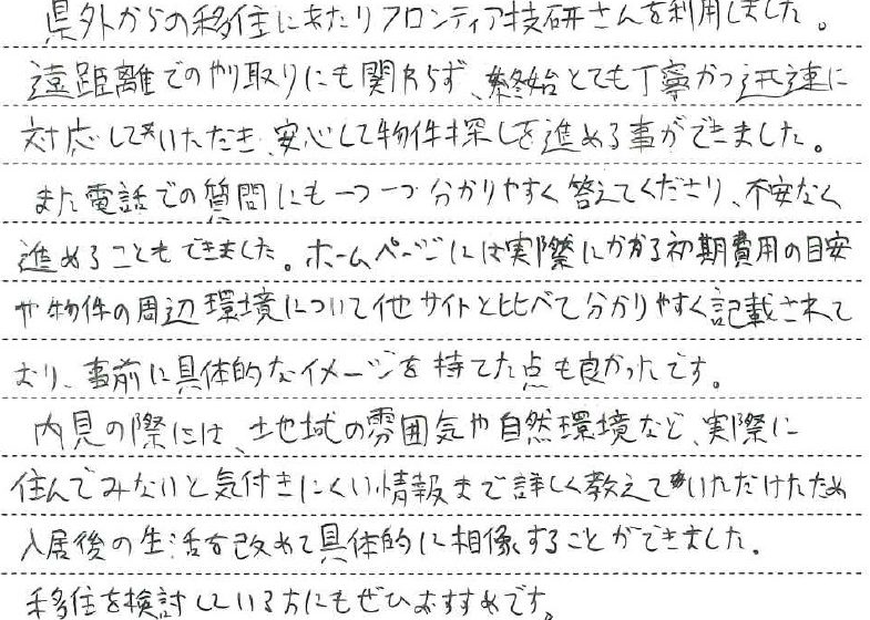 R・O様からいただいた「移住を検討している方にもおすすめ」という身に余るお言葉を糧に、これからも一人ひとりのお客様に寄り添ったサポートを続けてまいります。