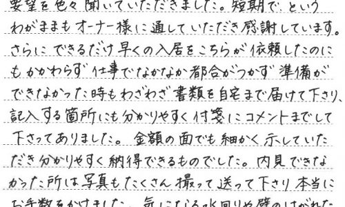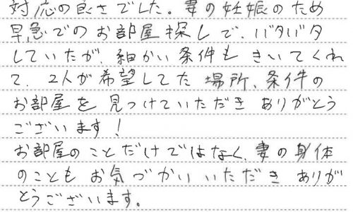 T・S様 この度はご契約いただきまして誠にありがとうございます。奥様の出産のご都合でお急ぎのお部屋探しとはなりましたが、無事…