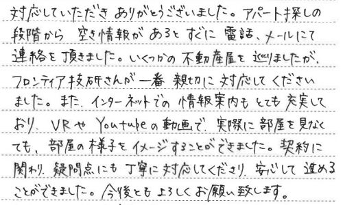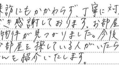 Y・H様 この度はご契約いただきまして誠にありがとうございます。お時間も無い中ではありましいたが、納得のいくお部屋が見つかって良かったです。…