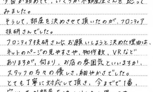 ご案内中に、以前のお部屋探しの状況のお話を伺ったのを覚えております。今回は比較的ゆっくりお部屋を探すことができ、納得のいくお部屋が見つかり何より…