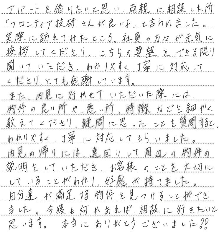 やはりこれから長い期間、生活をしていくお部屋です。こだわりがあって当然だと思います。ご希望条件に近いお部屋を紹介できてよかったです。