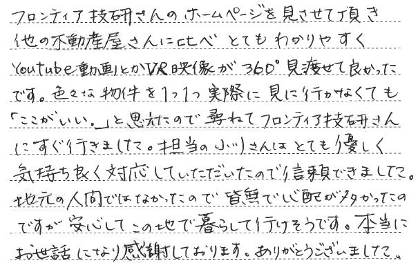 弊社のホームページでは写真や動画、360度画像などの情報と併せ、駐車料などをあらかじめ計算した月額合計費用も表示しております。遠方からの転居で土地勘もない中で、隅々まで見ていただき、ご活用いただけたようでとても嬉しいです。