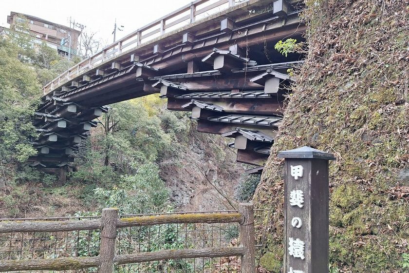 両岸から張り出した四層の「はねぎ(刎木)」によって支えられている「刎橋(はねばし)」という非常に珍しい構造です。